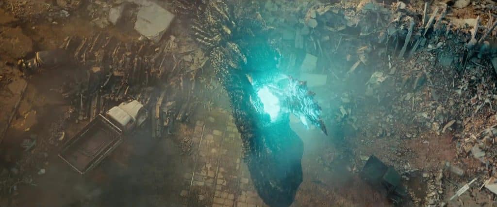 Like most main Godzilla films, the titular monster is a force of nature driven by his id. He just does whatever he wants cause why not? He’s a very big kid in a china shop, or whatever that metaphor is. Godzilla, in this sense, is very much an animal. A very destructive animal, but one all the same. Most of his behavior is reactionary and or predatory, like a shark or a T-rex. The vast majority of destruction comes from defensive actions after the silly humans freak out and attack. To their shock and awe, Godzilla’s retaliations are very, very violent. *Gulp*, which leads us to his Heat Ray. Godzilla’s Heat Ray in Minus One is, by far, one of the most powerful and destructive iterations of the big guy’s signature move. Building up energy for the blast takes time and causes the spikes on his back to pop out, swelling with light. He then takes a deep breath, and violently, all the spikes compress in unison as he hurls the bright blue light from his mouth. The ending result creates an atomic bomb-level explosion at the point of impact, decimating a large area around the blast epicenter. The trade-off for this much power comes at a cost, as Godzilla can only release the blast so often, and it takes time before he can perform another.