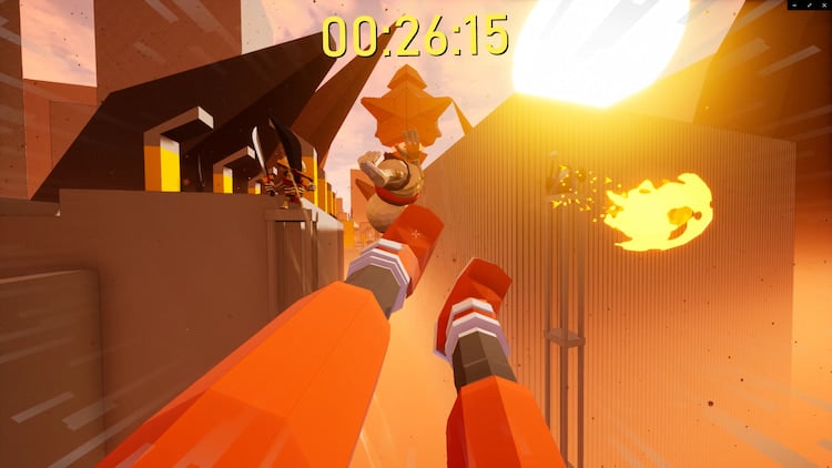 The second level type on display requires a little more strategy. Here we have a parkour playground; there’s a slightly opened world to traverse, with enemies littered across the terrain. The player’s goal is to eliminate every enemy in the least amount of time possible. The game’s merging of the combat and movement systems really shines through here, forcing confrontations with enemies to flow into one another at breakneck speeds to lock down better times. I think this level type will be the one that sees the richest routing – it definitely has the most speedrunning potential, with a focus on both intimate map knowledge as well as raw skill.