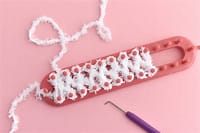 The looms are typically sold as a set, with a loom hook, a plastic yarn needle, and basic instructions for something like a hat and tube scarf. You perform the first knitting step, the “cast on,” by wrapping the yarn around each peg in a “Cursive E” looping pattern all the way around the loom. Here’s a tutorial for a loom knit hat with a visual breakdown of the first cast on step: