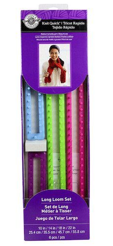 Knitting looms come in a variety of shapes and sizes. Some are even flexible! The 2 most common types of looms, which you can find at most major craft stores, are long rectangles or circular. The marketing focus is toward children as a beginner’s knitting tool, complete with the bright color scheme.