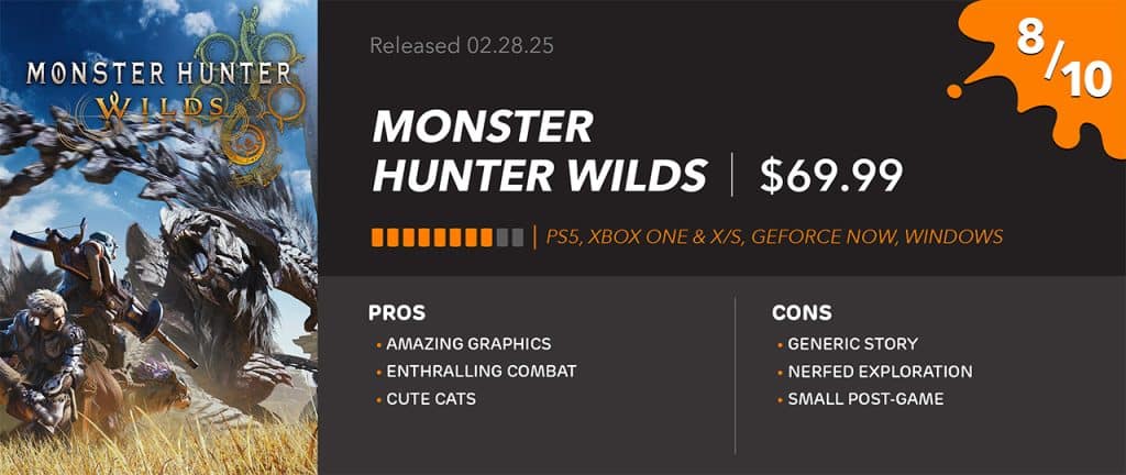 In a metaphorical sense, it is about six tiny cupcakes, all separated, that on their own still taste good, but the problem is, you’ve had cupcakes before. Monster Hunter: World was a massive cake-like experience; it was freshly baked. This game is more like smaller cupcakes but with sprinkles and some fancy icing. Wilds is an improvement in the places that matter; combat, graphics, gear appearance, and weapon specialization. However, it takes a massive step back in the areas that never mattered to Monster Hunter as a franchise but may matter to the gaming experience. Innovation has taken a back seat, with hand-waved improvements that don’t do enough to push this game to new or interesting heights.