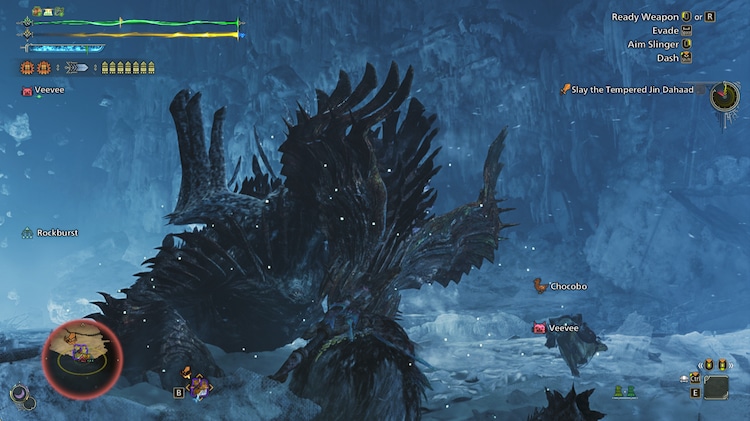 The slinger is far more balanced here; in the last game, MH: Rise, the main complaint was that the wirebug made things too easy. Now, any advantage the slinger gives is gained from foresight, being alert to when a monster may drop strong slinger ammo after a wound break, and can be used for fun mobility options such as swinging from a stick bug on the ceiling to avoid a ground attack. Mounting a monster can still result in a collision for massive damage, but only in a strategic moment.