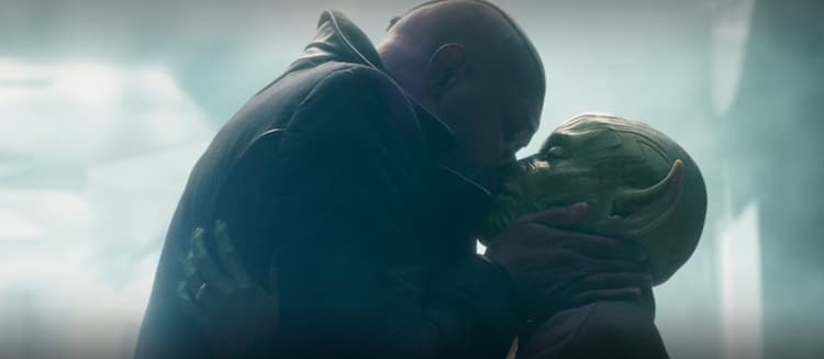 In the field where he first arrived from space, Fury calls for his extraction to the big space station in the sky. Before he boards the transport, Cilla arrives. Actually, Varra arrives, her given Skrull name. Fury, true to his word, loves Varra no matter what, and he smooches her Skrull face off. Varra joins our eye-patched hero on his journey to broker peace between the Kree and Skrulls.