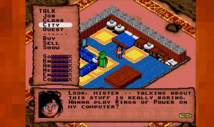 Rings of Power (Not related to the Amazon prime show based on JRR Tolkien’s Lord of the Rings) took inspiration from many places, Dungeons and Dragons, religious texts, The Lord of the Rings (Purely the books), Star Wars, and any number of tropes that existed during the nineties era of table-top roleplaying. But it wanted to do them on the Sega Genesis (Or the Megadrive to folks like me in Europe), early in its life too. It was released in January 1992. Imagine Ellie and Joel having a conversation and randomly coming out with this:
