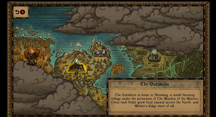 The art style is very consistent throughout, extending to the beautiful map system. As Arlo discovers new screens, the map is filled out with rough sketches on weathered manuscript paper. Landmarks are noted with an insignia, like a coat of arms, yet again fitting the game’s theme. As this game is split into a few different areas, there is also a world map that looks like it could have been depicted in an alternate-history Lord of the Rings book. It’s remarkable how cool and synchronised everything is.