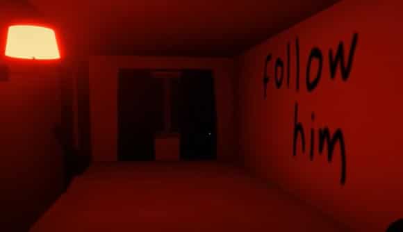 The game’s last act does kick it up a notch, and I was relieved. There is red lighting now and cryptic words painted on the wall. Follow him. Your character is falling deeper into darkness. There is actual blood on this part which made me happy! Yay, goriness! I like that… There still isn’t a lot to do, though, and you’re still walking around, trying doors, and looking at numbers on a wall.