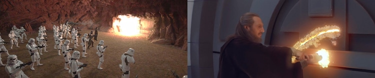 “Fire!” The Imps try to blast through the fortified hangar door. “Light ‘em up!” Reva screams again as she starts pacing in impatience. Hey Reva, you know what works really well on heavy blast doors? A Lightsaber. I couldn’t help but think about Obi-Wan and Qui-Gon using their lightsabers on the heavily fortified door to the bridge on the Trade Federation ship in Episode I: The Phantom Menace