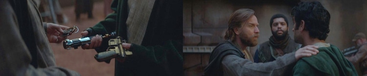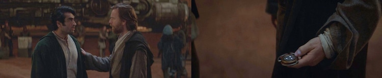 “He expects me to surrender. He knows I’ll do everything I can to protect these people,” he explains. “You’ll be on your own,” Haja interjects. “No,” Obi-Wan hands Haja his lightsaber, blaster, and comlink, “Haja, look out for her, will you?” Roken asks how he’s going to fight without his weapon. “There are other ways to fight,” Obi-Wan cryptically says.