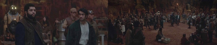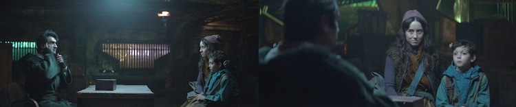 Obi-Wan sends Leia over to Tala, who is talking with two fugitives, the mother and the son, who escaped from Daiyu with Haja’s help. Here’s something interesting for hardcore Star Wars fans. The child’s name is credited as Corran. The mother’s name is credited as Nyche. In Part III of this series, when Obi-Wan and Leia are stowed away in one of ‘The Path’s’ safehouses on Mapuso, there is a name carved in Aurebesh (the Star Wars alphabet) on the safehouse’s wall: Valin Halcyon. Valin and Nyche are father and mother to Corran Horn, who is from Corellia, in Star Wars Legends. We’re still waiting on confirmation of the last name, but the coincidences are too many to not be directly referencing this character.
