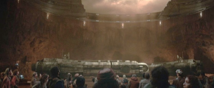Obi-Wan makes it back to the hangar. Roken greets him, “Everything is all set.” Obi-Wan runs over to Leia as she descends the ladder. They happily hug. “Well done,” Obi-Wan commends. “Where’s Tala?” Leia asks. Obi-Wan shakes his head. “Help who you can. Let’s get to the transport, people,” Roken calls out, rallying the people. The hangar is alive with hurried movement as everyone rushes to the transport. In the rush, Haja drops Obi-Wan’s comlink. Obi-Wan takes Leia’s hand and leads her to safety.