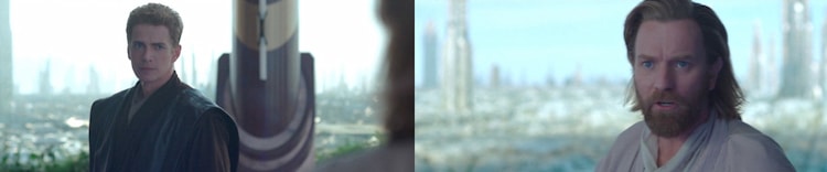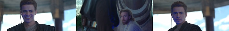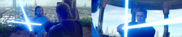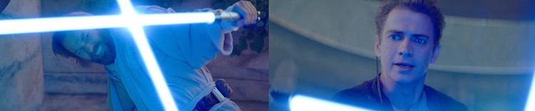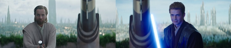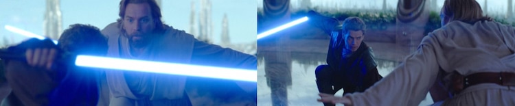 The training duel flashback sheds some light on how Obi-Wan outmaneuvered Anakin. Even though Anakin had knocked Obi-Wan’s lightsaber from his hand, rendering the Jedi Master weaponless, he still chooses to fight, seemingly unarmed. Obi-Wan avoids the lightsaber and lands a well-placed elbow, spinning around Anakin in an unanticipated move. Anakin, stunned, loosens the grip on his own weapon. Obi-Wan Force pulls the lightsaber from his Apprentice’s hand, “You’re a great warrior, Anakin, but your need to prove yourself is your undoing. Until you overcome it, a Padawan you will still be.” Obi-Wan hands Anakin back his lightsaber with a friendly smile.