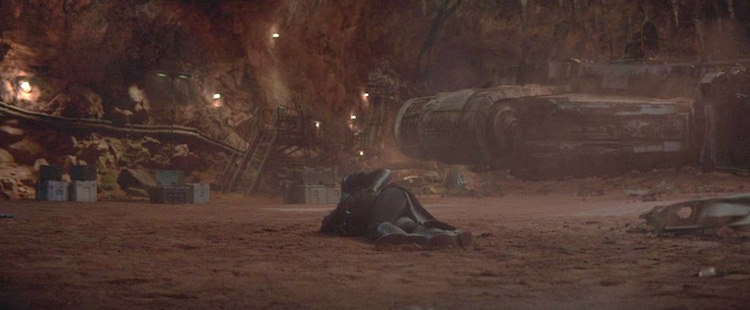Alone, Vader angrily marches down the tunnel toward the hangar. Just as the transport lifts off, Vader reaches out a hand, and Force holds the entire shuttle preventing it from escaping. The shuttle strains against his hold, but to no avail. The engine spits and sputters, finally failing. Vader drops the ship back in its former resting place. He immediately starts brutally Force ripping apart large sections from the side of the shuttle. Impressive. Once Vader thinks he is victorious, he realizes the transport is completely empty. Another transport just behind the wrecked ship zooms out of the hangar and away to safety. He watches it go.