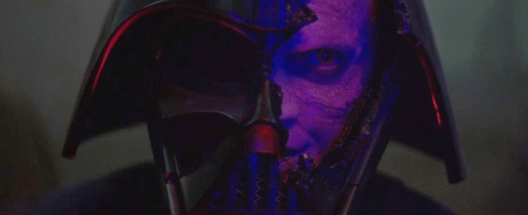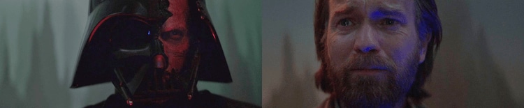 Vader slowly stands up, his melted brow set, hatred and anger simmering in his eyes. “Anakin is gone. I am what remains,” His voice is a slightly synthesized version of Hayden Christensen’s voice instead of James Earl Jones’s iconic voice. The opening in his helmet allows his real voice to be heard. Hearing ‘Anakin’ again within the suit makes the encounter feel unreal. A distorting of realities. Obi-Wan is stricken with grief, his eyes well up, “I’m sorry, Anakin. For all of it.”