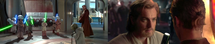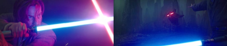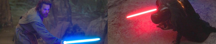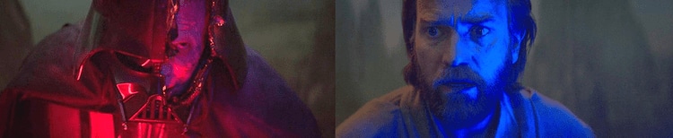 Vader takes a breath, staring out from beyond the partial cover of his mask, “I am not your failure, Obi-Wan,” his voice distorts between Hayden’s and James’ Earl Jones on Obi-Wan’s name. “You didn’t kill Anakin Skywalker. I did,” he impishly smirks in Hayden’s voice, “The same way I will destroy you!” The play of red and blue light from the lightsabers off of the helmet and Vader’s face within the mask is a great storytelling element showing the ebb and tide of the flow of the Force and the rise and fall of good and evil within the galaxy entwined in this mechanical man’s destiny.