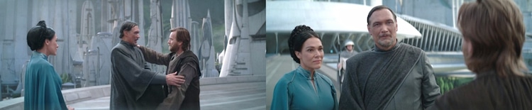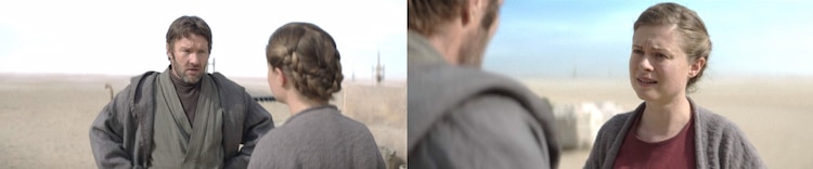 Obi-Wan finds Haja sitting with Leia. Haja gets up to give them a moment together and whispers to Obi-Wan as he leaves, “I talked to her. You’re welcome.” “You said you’d take me home,” Leia says as Obi-Wan approaches. “I wish that I could, Leia. Really, I do. Please tell your father I tried,” Leia seems to feel he means what he says.