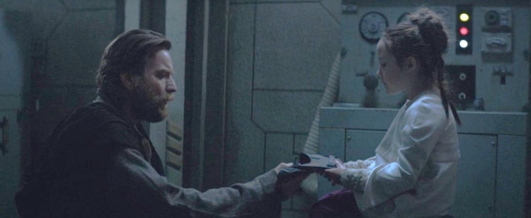 Leia is used to meeting new people frequently and asks about their new arrival, “More cousins?” Obi-Wan descends the ramp with a large grin on his face. Ewan McGregor always makes departing a ship in Jedi robes look cool. Lola is right behind him. “Who am I to separate a young lady from her droid?” Obi-Wan jokes as Leia excitedly runs to reunite with her droid.