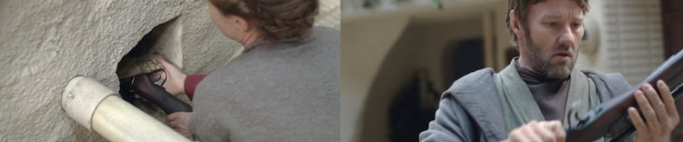 “We both knew this day might come,” Beru moves some boxes away from a wall and pulls some guns out of a hidden cubby, throwing one to Owen, “She’ll come when the suns go down. Best we get positioned now.” All right, Aunt Beru! She’s a ma’am with a plan. She’s thought about the ‘what if’ scenarios in case Luke’s secret ever were discovered and has some basic strategies to ward off attackers. Despite Owen keeping Obi-Wan from the boy, it’s clear from this situation that he was heavily relying on Obi-Wan to watch out for Luke and come to their rescue if danger ever neared.