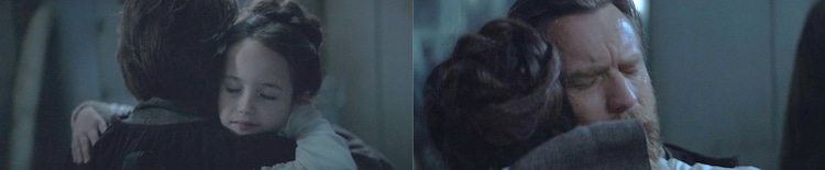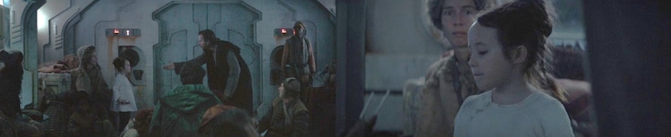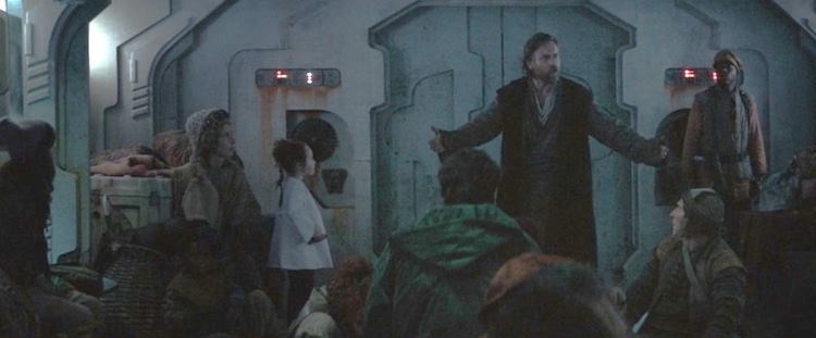 Obi-Wan raises his voice so all can clearly hear him, “You are all the future.” Obi-Wan looks down at Leia, “You are the future,” Obi-Wan looks back to the group, “You’re what needs to survive,” there is steel in his voice. Vivien Lyra Blair does an amazing job capturing a younger version of Carrie Fisher’s reactions in this scene.