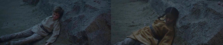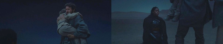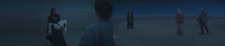 Obi-Wan returns to Tatooine and lands right on the Lars’ homestead. It’s night, and he can hear Owen and Beru out in the desert calling for Luke. “Where is he?!” he joins them. Obi-Wan offers to search the Dune Sea and won’t stop until they find the boy. Beru sees another figure approach, a long dark robe swinging in a hobbled approach. Reva is carrying the limp body of Luke. Obi-Wan, Owen, and Beru tensely wait to know the status of the child.