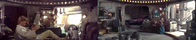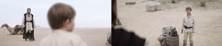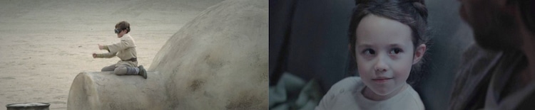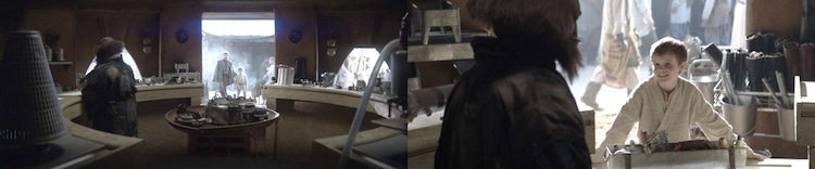 The twin suns set over the desert of Tatooine. Night falls. Owen and Beru take Luke to a secure room. This room is the same room where Luke discovered the hidden message in R2-D2 from Princess Leia in Episode IV: A New Hope with the infamous line, “Help me, Obi-Wan Kenobi. You’re my only hope.” It is also the same room Anakin gave Padme his speech, “Someday I will be the most powerful Jedi ever,” in Episode II: Attack of the Clones after his mother, Shmi’s death.