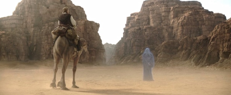 Obi-Wan traverses the Tatooine desert on his eopie. As he is about to enter Beggars Canyon, where many years ago, a bet on a podrace freed a slave child that changed the fate of the galaxy, an old friend and mentor appears, “Master Qui-Gon.” “Well, took you long enough,” Qui-Gon says with his hands on his hips. “I was beginning to think you’d never come,” Obi-Wan is clearly happy to see his old Master. “I was always here, Obi-Wan. You were just not ready to see. Come on. We’ve got a ways to go,” Qui-Gon turns and fades as he leads Obi-Wan into the canyon.