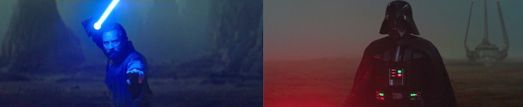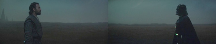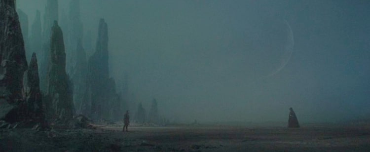 Darth Vader follows Obi-Wan down to the barren moon. He slowly descends the ramp of the Lamba-class shuttle. Vader does not need to search for his quarry. The master is waiting for his old apprentice, unlit lightsaber in hand. A waxing crescent hangs low in the barren moon’s sky while tall rocky crevices meet a barren plateau. A foreboding haze sets a dramatic stage for a long-awaited duel.