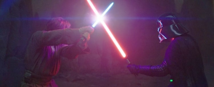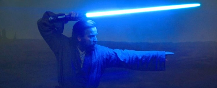 Vader angrily faces off with Obi-Wan, “Have you come to destroy me, Obi-Wan?” Obi-Wan ignites his lightsaber, the blue light cutting through the darkness, “I will do what I must.” Obi-Wan takes his signature fighting stance, lightsaber in his right hand, held overhead, extended parallel to his left arm, held straight out in front of him. Cue the chorus. Literally. Obi-Wan is not playing games anymore. Any doubt he once had in facing Vader is gone. “Then you will die,” Vader angrily ignites his red blade.