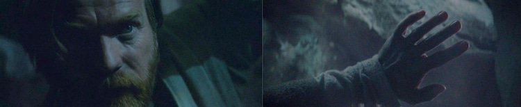 Down in the pit on an unnamed barren moon, Obi-Wan uses the Force to hold the boulders Vader had buried him with at bay. He strains with effort as the ghosts of the past attempt to haunt him and bury him further. “This is the end for you, my Master. Admit you are beaten,” Anakin’s voice echoes in his mind. “You cannot run, Obi-Wan,” Vader’s voice plays into the cacophony. “You’re my enemy,” Anakin whines. “You should have killed me when you had the chance,” Vader taunts. “I do not fear the dark side,” Anakin affirms. “I am what you made me,” Vader reminds. This was a very cool use of the character’s past entwined with the present.