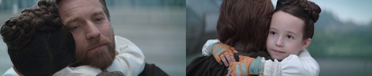 Obi-Wan and Leia share a sentimental moment, silently reassuring each other, and finally, Leia gives Obi-Wan a big hug. “Come back. Please,” Leia quietly says. “I promise,” Obi-Wan says with a smile. I love their dynamic here. Obi-Wan seems to be genuinely happy to have met and spent time with Padme and Anakin’s daughter, seeing how much of a difference she will make in the galaxy as she grows up. Even though she doesn’t know her true origin story, Leia seems to be happy to have someone who was once connected to her real parents in her life and who truly cares about her and her survival. She was rescued by a real Jedi!