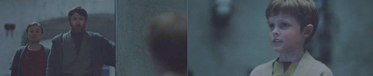 Reva lays Luke in the sand and kneels at his side. Luke moves slightly. At the first sign of life, Beru and Owen approach Reva and Luke. They look bewildered, relieved, and thankful, not fully understanding what transpired tonight on their homestead. They pick up the child and head into their home, leaving Obi-Wan and Reva alone.