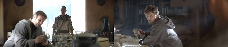 Back on Tatooine, Uncle Owen brings Luke to Mos Eisley to shop for a part for their speeder. “What do you need, kid?” the shop owner asks Luke. “We need a new belt for the speeder,” Luke explains. Owen grumpily adds, “A certain somebody broke the last one.” The shop owner seems amused by this, “Your uncle’s a patient man.” “I’m not that patient,” Owen corrects. This whole exchange is very cute.