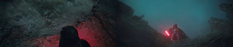 Blades collide, but Obi-Wan Force pushes Vader back a long way and uses the distance to gain momentum for his next attack. Obi-Wan runs, parkouring off a large boulder to Superman slash Vader across his helmet. Vader’s shell has been cracked. On a knee, breathing heavily labored, helmet sparking, Vader is in no rush to get back up.