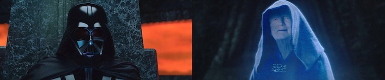 “I wonder if your thoughts are clear on this, Lord Vader,” Sidious places doubt in his apprentice’s ability, “Perhaps your feelings for your old master have left you weakened. If your past cannot be overcome…” The veiled threat. “Kenobi means nothing. I serve only you, my Master,” Vader assures. As the camera pans away and Vader is left alone on his throne, we hear the Imperial March for the first time in the series.