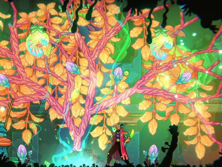 Ultros is visually striking. It’s unique in its color palette, incorporating neon greens, oranges and reds. It’s like a ’90s rave threw up on screen, in a good way. The artist behind the environments was also the artist for Hotline Miami. You can see the similarities in its excellent art style. There can be moments when objects or enemies on the screen are difficult to see because of the mix of colors in the background, but it doesn’t take away from the beautiful scenery.