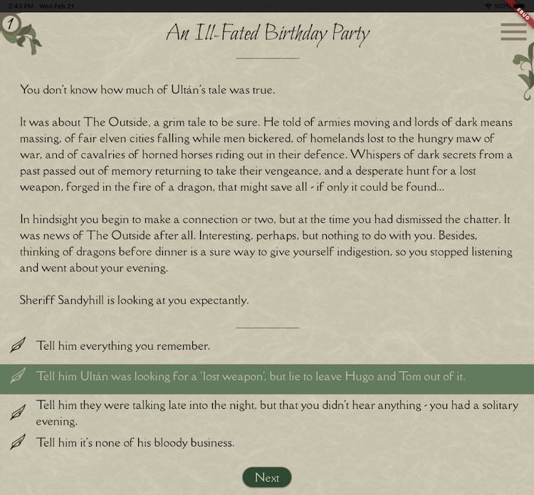 Choose your own adventure stories, aka secret pathbooks, were popular in the 1980s. The original series contained 184 books. The series was unique. It was written in a narrative style that placed you, the reader, in the center of it all. Throughout the adventure, the narrator gives you a choice and two sets of page numbers to turn to so you can find the outcome of your choice. To Gen X kids, this was mind-blowing! I had one of these books and I could not get into it. The story was great, but trying to turn the pages I needed was difficult due to my disability, and with the particular book that I had, some of the scenarios were written upside down! So I gave up. Fast forward to today, and an app called Halfling Dale was created by Wysiwyg Wizards, a two-member team of English app developers that love fantasy, as they strive to make immersive, interactive experiences that are story-driven and easily accessible. The developers reached out to Couch Soup and granted full access for an honest review of this indie story game.