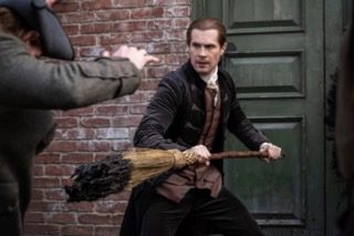 After Flora’s address, John Grey questions Jamie about his affiliation with the Sons of Liberty. John expresses his concerns and asks Jamie to disassociate himself from them. When Jamie declines to share more information, Mary comes to get John, telling him there’s trouble in town. Protesters are rioting at a print shop that’s printing a picture of Flora in the boat with Prince Charles. The material requests Flora’s fellow countrymen not be led astray by schemes of rebellion. Jamie sends Mary away for her safety as the crowd continues to grow more riotous. They want to tar and feather the printer, and John is defending the shop with a broom. Jamie is struck with hot tar, and the printer is shot in the arm—the first blood spilled in the revolution (as far as the show goes, anyways). Soldiers break up the mob, and Major MacDonald gives Jamie a nod of respect. At least they still view him as allied to some degree, which should make for a good cover.