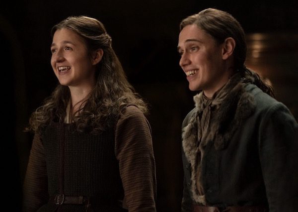 However, Lizzie is pregnant and she’s unsure which of the twins is the father. Claire has a conversation with her and explains that due to the attitudes of the time, Lizzie is in a very dangerous situation. Back then, they would stone people for fornication. Lizzie doesn’t want to choose between the twins, though, because she loves them both, and they love her in return. Claire is pretty understanding, but Jamie wants to see her married to keep her safe from stoning. He makes the twins draw straws for who gets to say “I do” and pronounces Lizzie and Kezzie handfast.